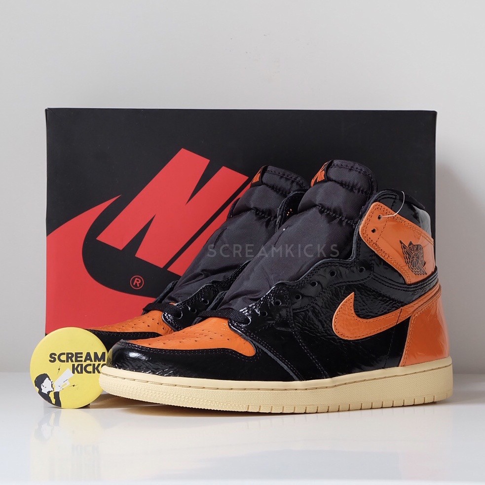 Black and orange patent leather with a crinkled finish
